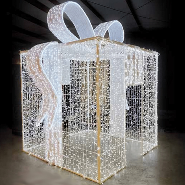 - 10’ x 10’ Box shown with 3’ white/iridescent garland bow on top.