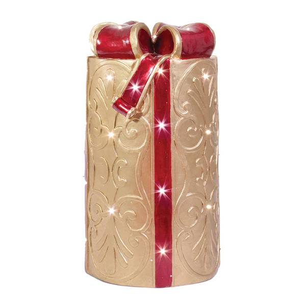Deck your holiday display with our Lit Round Fiberglass Gift Boxes this season! This illuminated prop’s swirling design and gold surface is accented with a shimmering red fiberglass bow for an extra festive touch. Pair this round gift box with our other Lit Fiberglass Gift Boxes for visual texture.